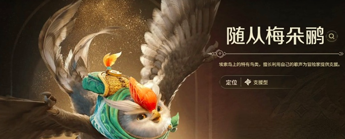 第二位高推荐的随从是梅朵鹂,它的形态是一只可爱小鸟,在游戏当中定位为支援型随从。该角色可通过声波来进行战斗效果的增益,而且还可以实现高效的状态恢复,对于团队的生存效率大大提升。并且这位随从有着比较好的治疗效果,或者是一些长时间的持续性战斗,选择这个随从会更好,不过需要提醒的是,这个随从整体的操作难度会比较高,对于新手玩家来说,适配度不强,中后期玩家可考虑选用。