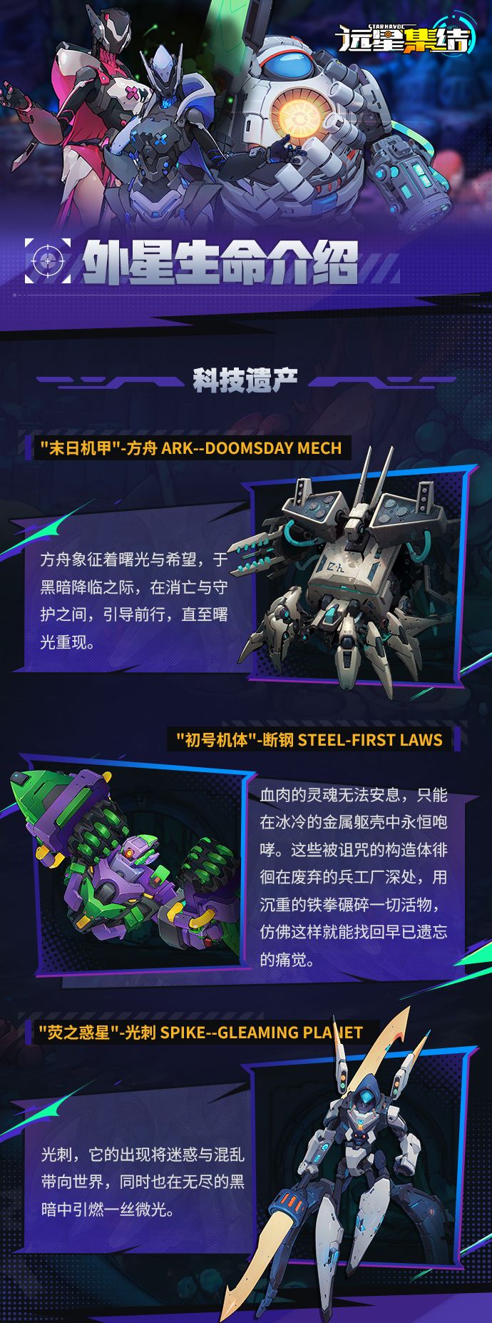 远星集结科技遗产是远星战场上最具威胁的机械造物系列,其代表包括【末日机甲-方舟】与【初号机体-断钢】等。它们既是文明毁灭的象征,也承载着对救赎的最后渴望,作为强大BOSS,为玩家带来了充满悲剧色彩与史诗感的终极挑战。