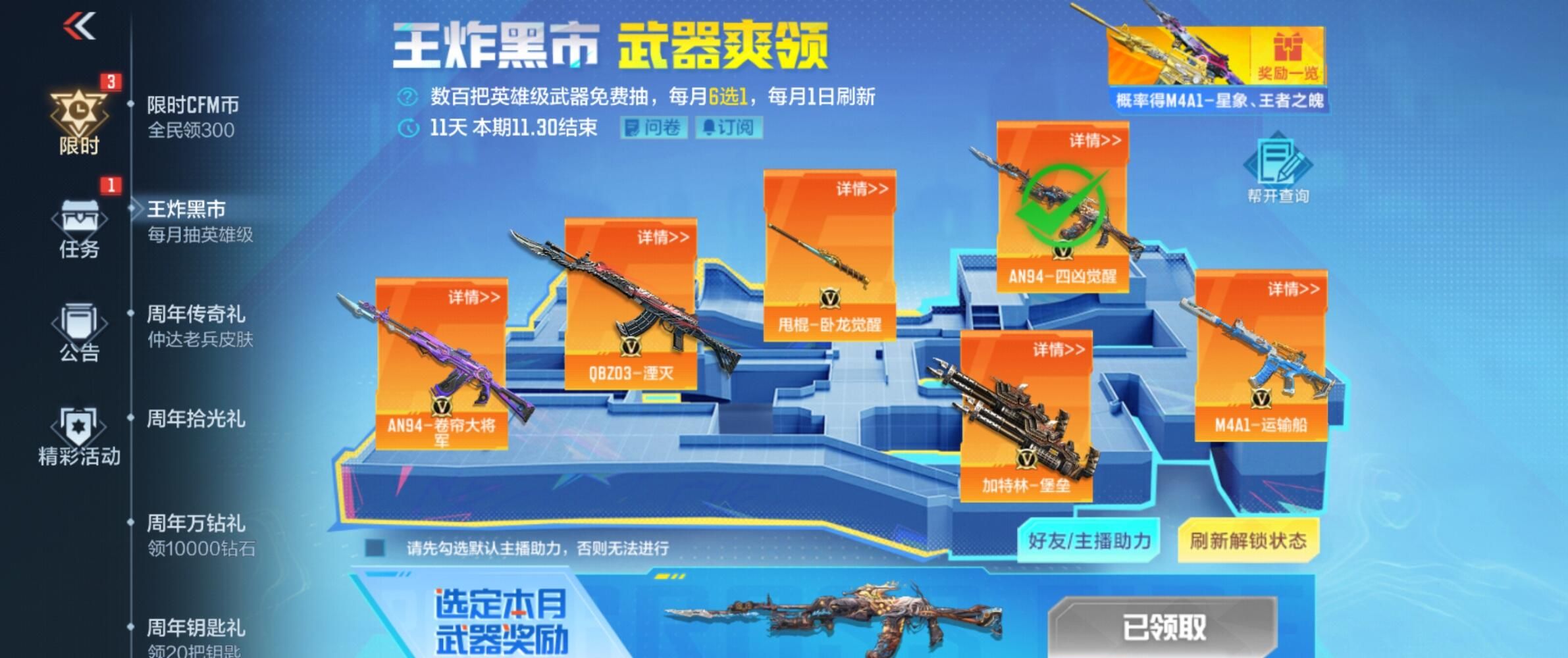 王炸黑市活动主要是利用抽卡的机制,通过抽卡的方式来获取对应的福利,一般是每月默认有三次开门的机会,这个机会只需要玩家登录游戏就可以获取,玩家需要注意,此时需要完成排位赛,也可以邀请自己的好友助力,另外,玩家还可以在获得三次机会,这样的话就有6次可以抽卡的机会,玩家在抽卡的时候会随机获得英雄级别的武器。一旦玩家领取之后,这个武器就不会再次出现。