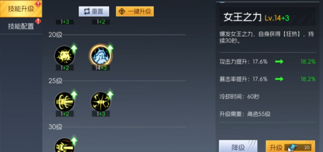 那么后期在20级之后,还没有达到40级的时候,大家就要注意,需要足够强的爆发技能才可以应对此时遇到的同等级敌人,进入到这个阶段的时候,大家基本是达到了中期需要的强度,在其中有一个技能是20级的时候就可以解锁的必点技能,也就是女王之力这个技能,这个技能属于一个可以带来全方位提升效果的技能,她点起来之后,就可以让神枪锁在30秒时间之内都进入到一个狂热的状态当中,只要是处于狂热状态当中的敌人,提升效果是非常明显的。