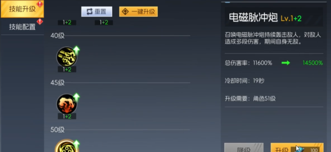 在霸体生效之后,神枪手是无敌的,而且还可以破坏敌人带来的护盾,所以用作这个技能的话可以给神枪手带来足够的保命机会,最后在50级的时候,大家就可以将电磁脉冲炮这个技能给她搭配起来,这个技能属于神枪手最好用的一个技能,拥有目前最高的伤害倍率效果,而且在使用这个技能的过程当中,神枪手一直是无敌状态当中,所以目前相对来说她能够将这个技能点起来的话,就说明她的奥义技能已经达到最高强度的效果了。