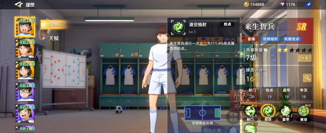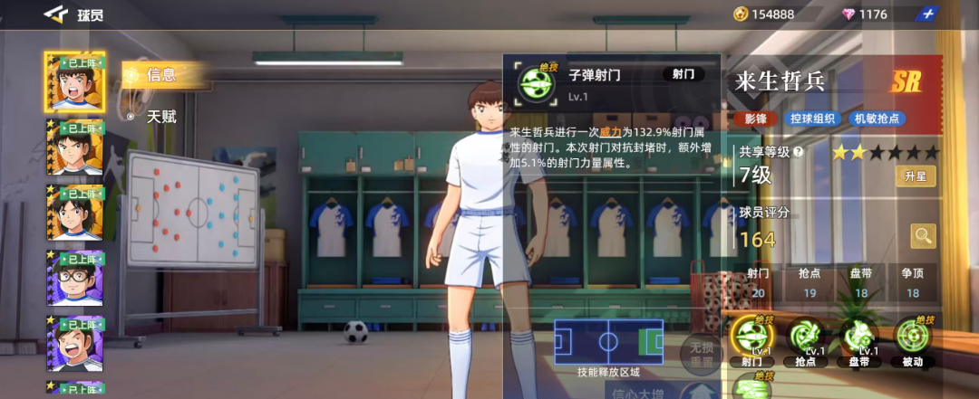 凌空抽射这个技能一般是来生哲兵进行抢点的时候会用到的技能,使用这个技能的来生哲兵会进行一次威力为111.4%抢点属性的抢点,玩过SR品质球员的玩家对于这个百分比应该还是比较眼熟的,且在其中造成的生效区域也不算大,要使用的话,在其中只能是根据他本身的属性有加成,才能维持住他在抢点上面的优势效果,然后在虚晃摆脱这个盘带技能当中,来生哲兵会进行一次威力为111.4%盘带,所以基础的百分比也是比较一般的,盘带能否成功也是看当前敌人的状态。