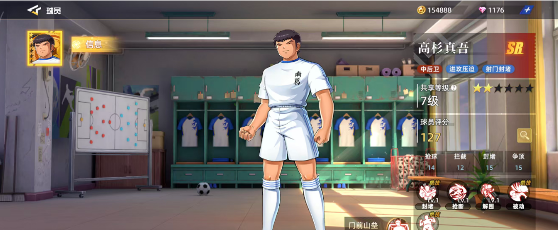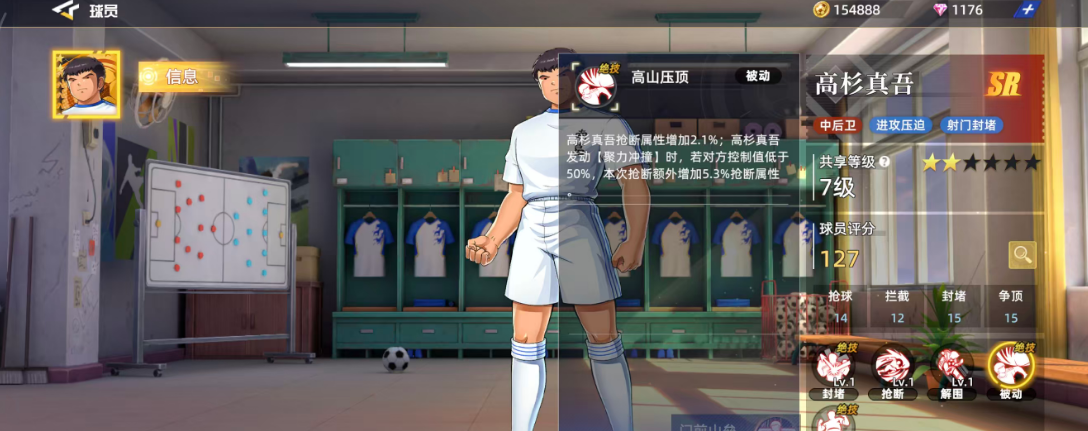 高杉真吾作为前期用的比较多的一个SR球员,放在中后卫才比较好用,如果用高杉真吾来作为进攻的主要核心,其实他带来的压迫力也是很大的,利用自身的射门动作加上封堵优势,可以带来的位置效果也能够配得上这样的品质设定,目前他在整体的球员评分当中获得了127的评分,球员现在的六维图当中他有一个很明显的短板,在抢球效果当中只有14的评分,其余抢球14、拦截12,封堵15、争顶15都是比较均衡的,也都是后期在中后卫的位置上面可用的能力。