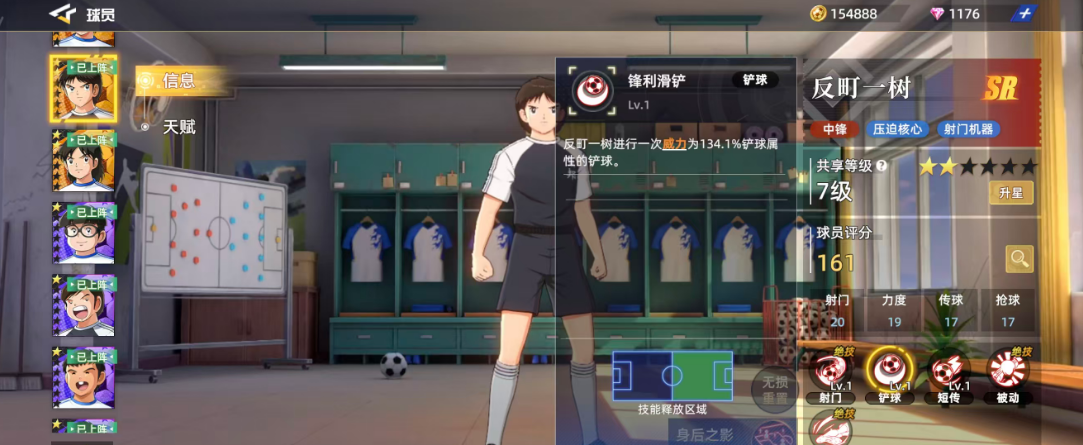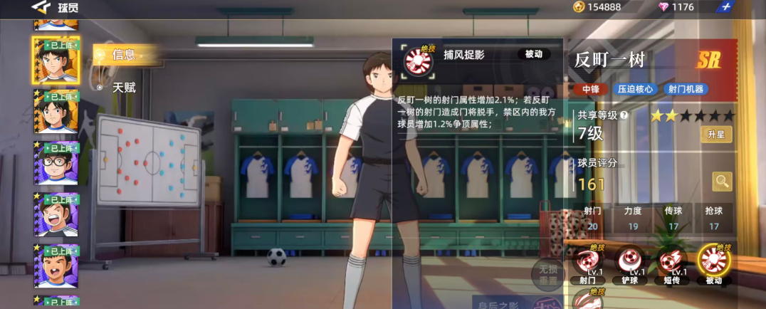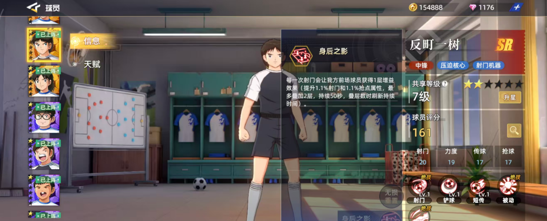 他除了这一个绝技是被动触发之外,还有另外一个利刃打磨也同样是被动绝技的效果,在游戏场上反町一树根据这个被动会带来铲球属性的提升,此时也同样会增加2.1%的数值,然后在反町一树的铲球动作命中对手后,会导致本次铲球削弱对手的控制值带来额外削弱值2.1%的提升效果,在最后的技能当中反町一树可以用到的就是身后之影这个技能,这个技能是他每一次使用射门动作的时候都会用到的,其中效果会让我方前场的球员都获得1层增益效果,这里的增益就是获取1.1%射门和1.1%抢点属性上面的增加,所以给我方球员带来的提升空间还是比较大的,后期还可以叠加2层,持续时间也接近一分钟了,有50秒的持续时间可用。
