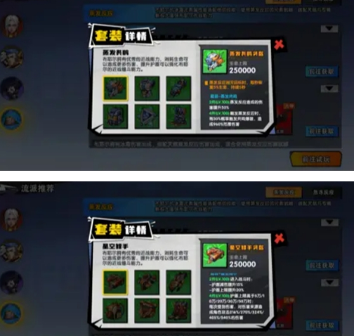 分别为两套,蒸发套,星空套,推荐搭配:竞技套:蒸发护手,蒸发心核,星空头盔,星空衣服,星空背包,星空鞋子(肉套,高额的护盾,护盾恢复,护盾减伤,同战力可直接反伤反死)副本套:蒸发衣服,蒸发护手,蒸发心核,蒸发鞋子,星空头盔,星空背包