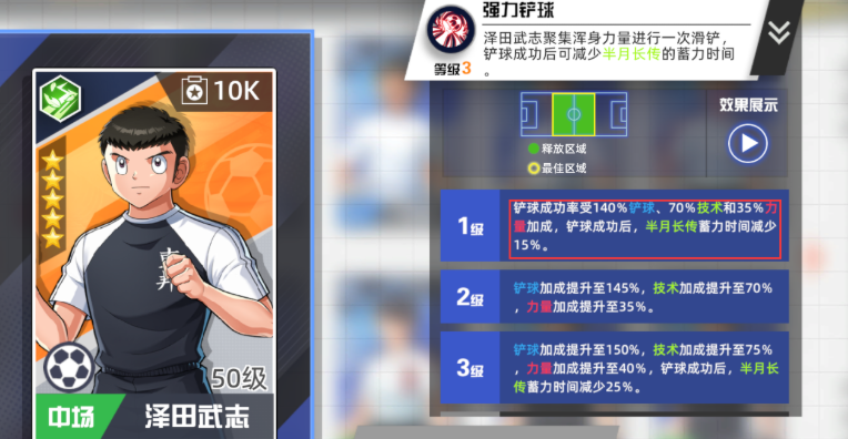 而且游戏当中除了这些属性的球风进行加成之外,大家也可以注意到还有一些球员他们自身的技能效果上面除了主球风之外,还有一个副球风加成,比如说泽田武志在游戏当中他带来的加成效果,同时有技术以及力量这两类球风的加成影响,比如说他的强力铲球技能,可以根据他的滑铲动作带来减少长传的蓄力时间,这样的效果在1级的时候就可以生效,所以此类效果可以让他在主球风以及副球风属性都带来加成的时候,得到足够的传球优势。