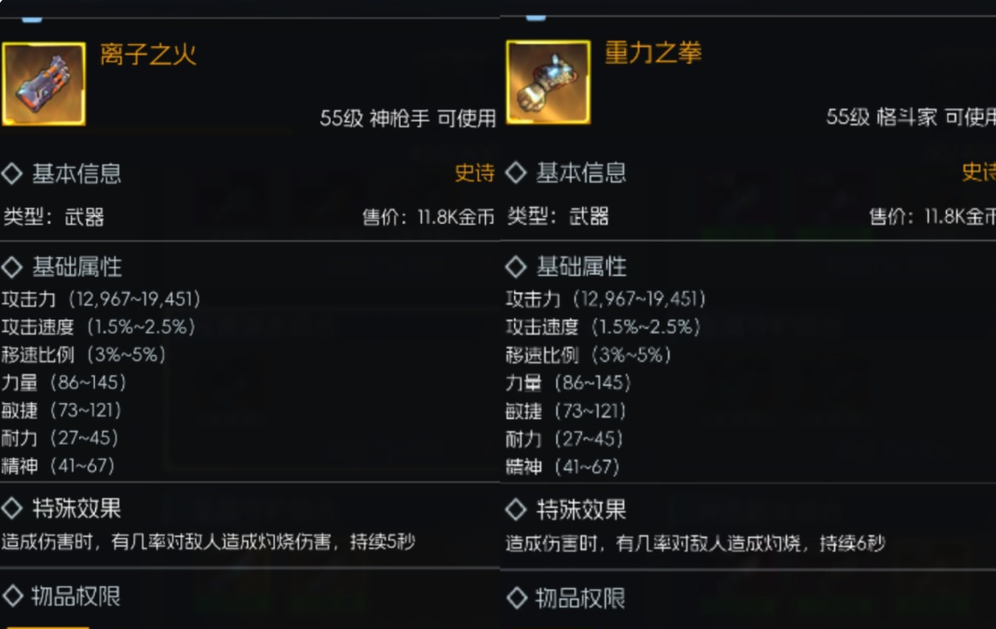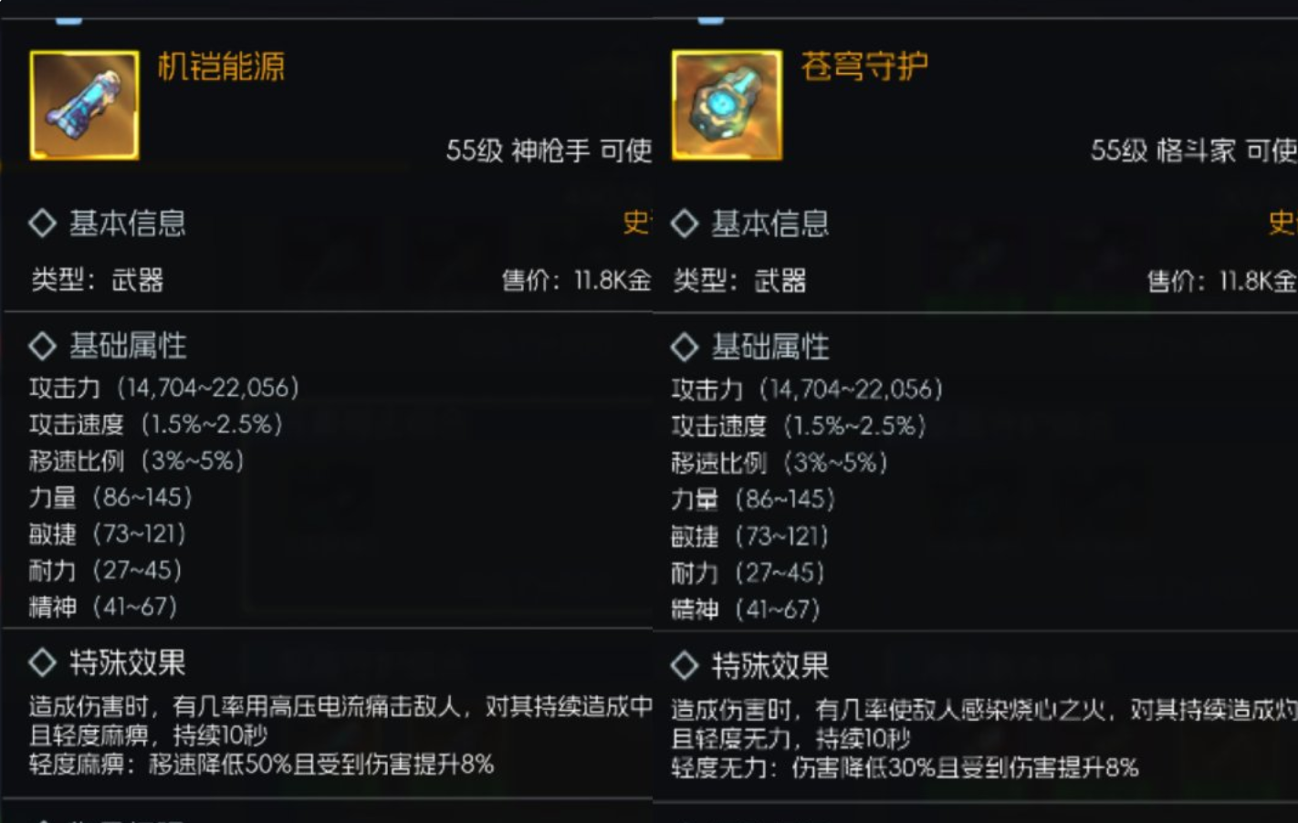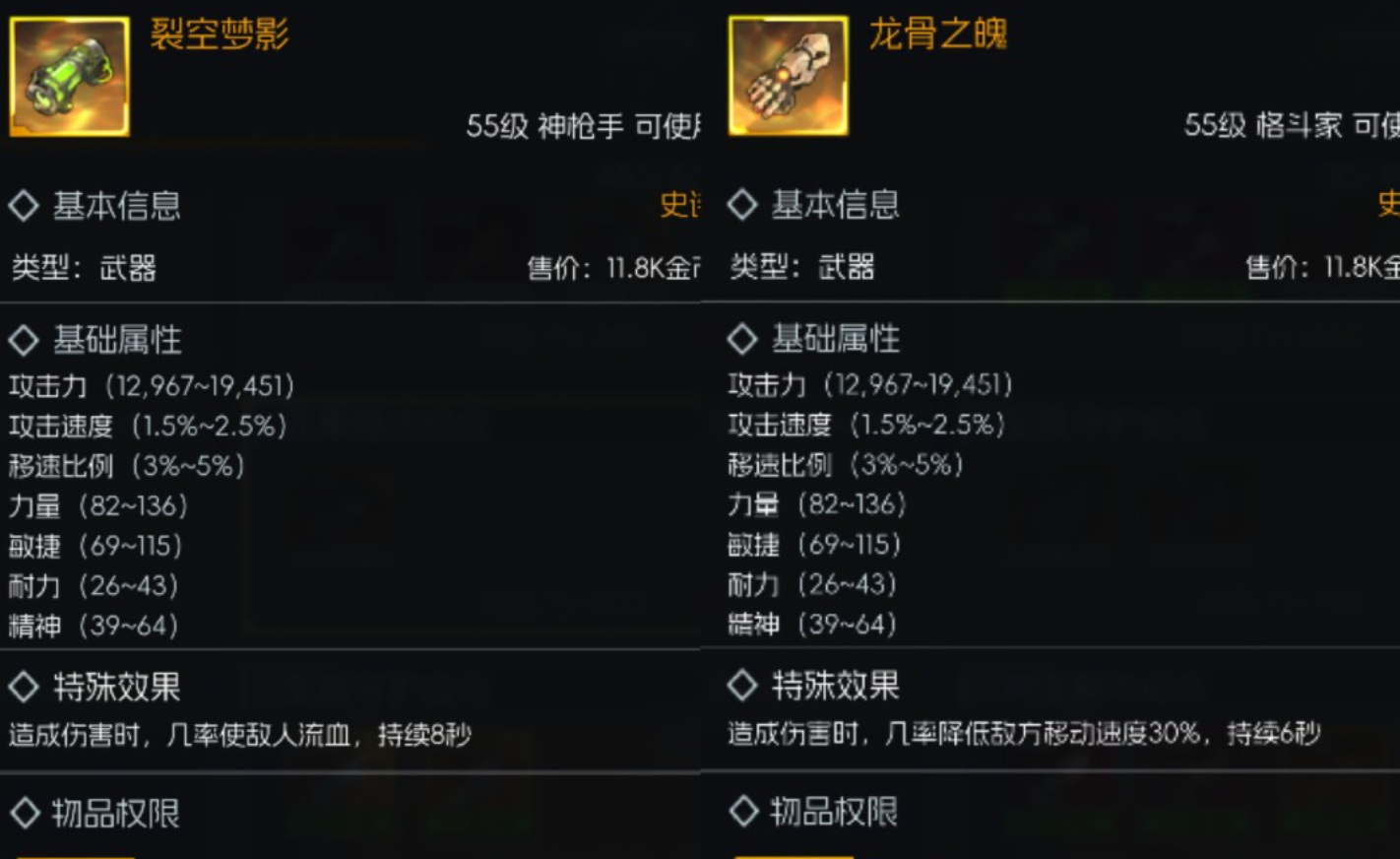基础武器是玩家进入55级阶段的过渡装备,代表性的有汉娜-裂空梦影、黄帽-龙骨之魄。此类武器的基础属性比较均衡,可以通过普通打造或者深渊副本掉落获得,性价比较高。特殊效果分别是流血和减速,虽然伤害力小,但是在初期副本以及PVP中却能发挥作用。入门装备可以积累材料、获得经验,为之后获取更高级的装备做准备。