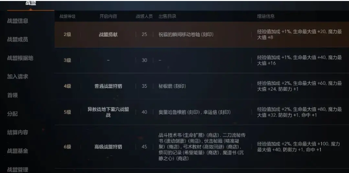 提升战盟等级后,所有的战盟成员会获得额外的属性加成!而且战盟等级越高,加成属性越高。