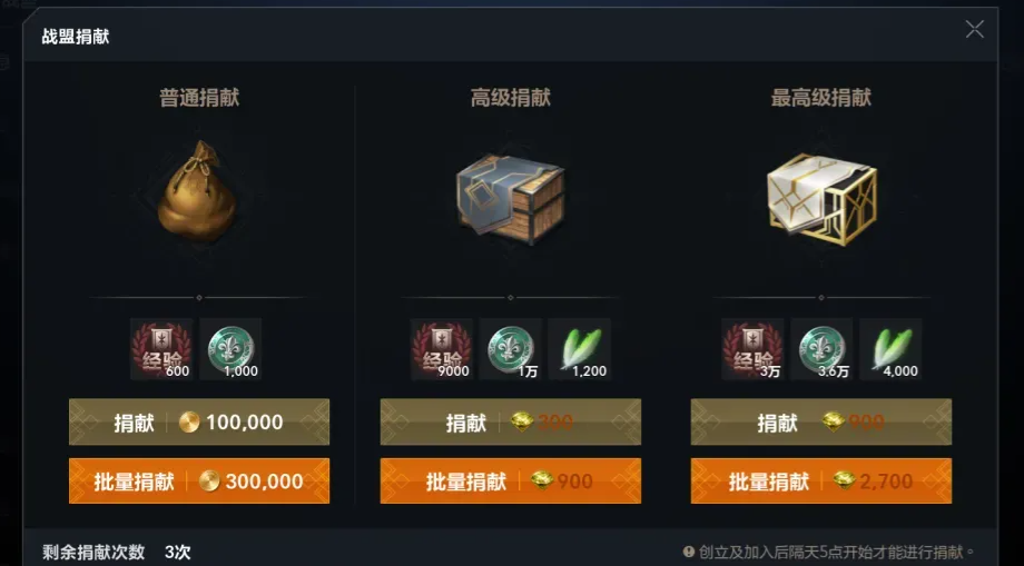 捐献每日至多3次,最基础的是金币捐献,每次10万金,完成后可以获得战盟经验以及名誉勋章!