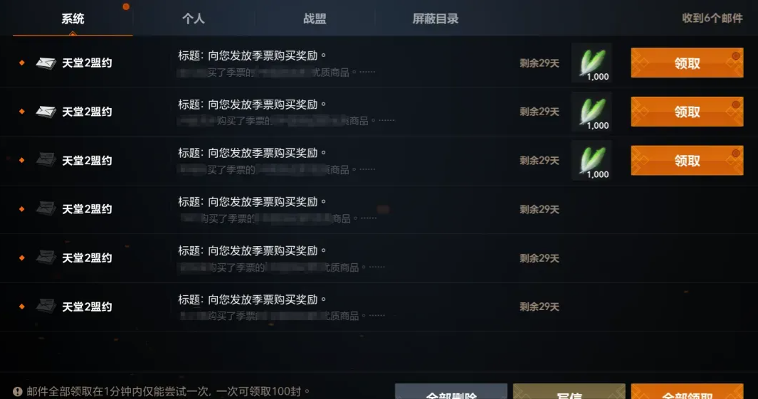同盟成员购买季票后,盟内的其他玩家也能收到奖励道具“殷海萨恩宠”~使用该道具刷怪可以获得成倍的经验以及金币!
