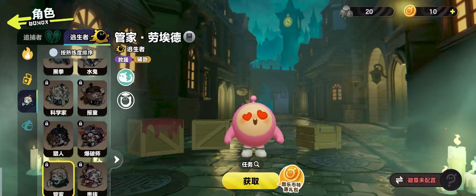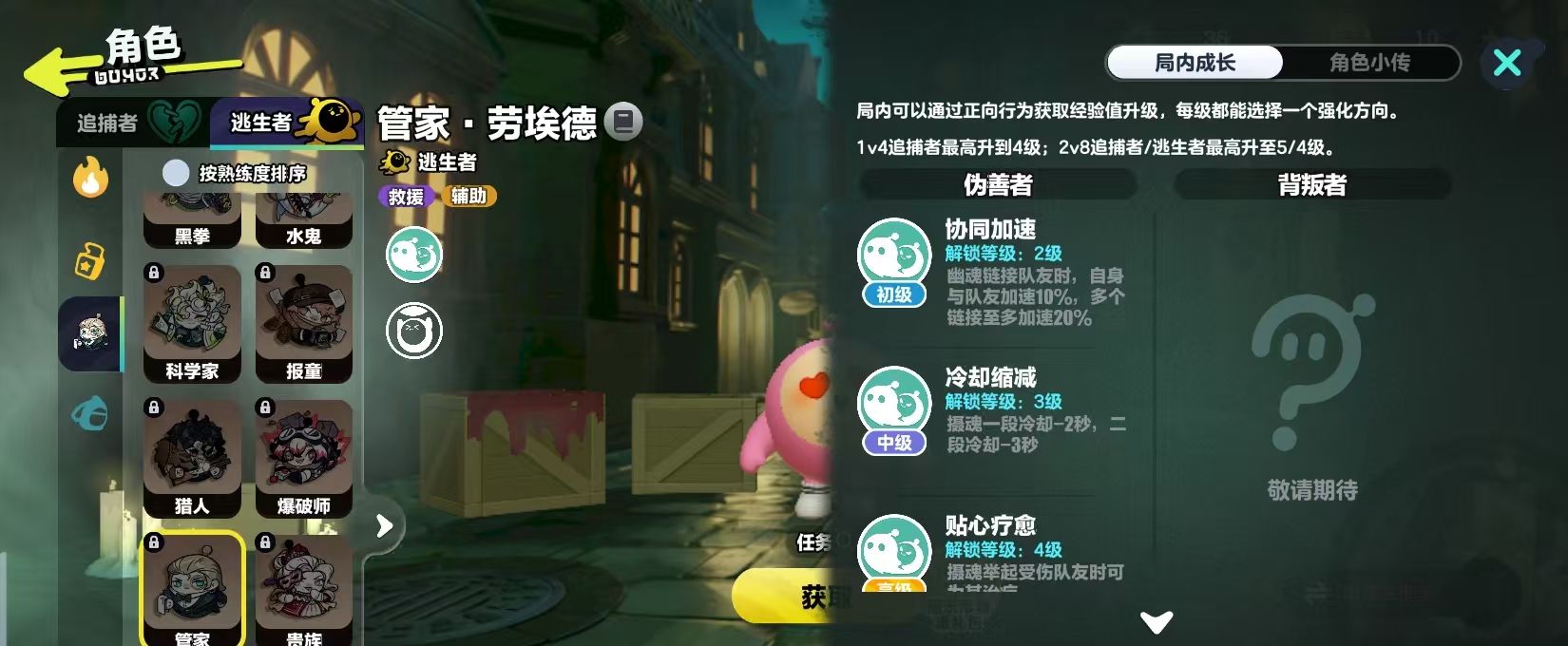 而这一个角色在获取时有三种不同的方法,首先可以通过局内的战斗还有日常任务去获取惊魂矿。这种货币就能够去购买,管家所需要的数量是600个,如果玩家觉得这个方法有一些复杂,也可以选择通过酷乐币购买,同样只需要600个,相对比较简单。通过任务也可以获取,例如扮演逃生者获胜5场之后马上就可以解锁,通过实战积累也可以免费的将它纳入到阵容中,对那些喜欢逃生玩法的玩家而言。这一个解锁方法还是很有趣味性的。