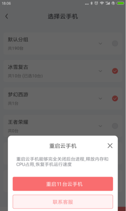 2、点击对应的功能可以对所选中的云手机分组,进行批量操作,如批量上传文件、批量重启云和搜集、批量一键新机(此为gvip以上云手机IDE功能)、批量恢复出厂等;如批量重启:
