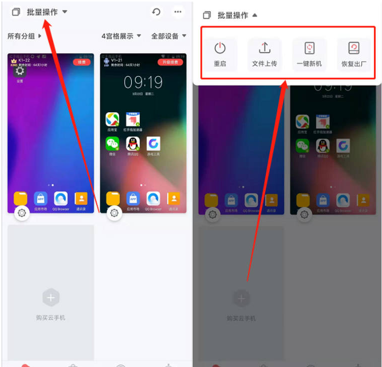 1、进入红手指专业版安卓app,点击主界面的批量操作按钮,呼出的云手机批量管理功能包括:批量重启、文件上传、一键新机、恢复出厂等操作。