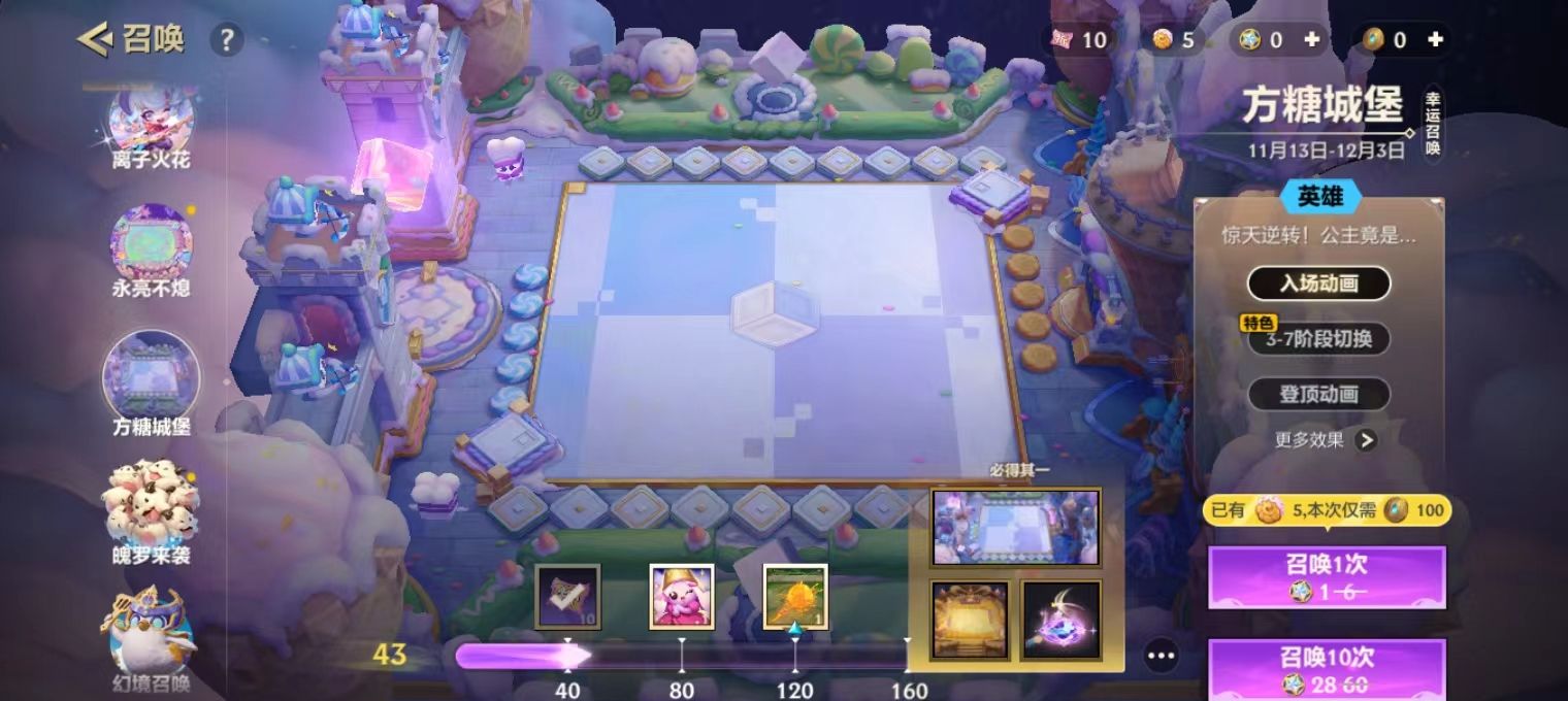 方糖城堡作为英雄级的棋盘,想要获取,那就需要看个人的运气。在幸运召唤中初始的概率是1%,实际测试下来,大部分的玩家在300多左右就可以保底出货并不算特别的坑。在这一次幸福召唤池中还会同步上线焦糖厨房,如果喜欢温馨风格的玩家也可以选择,但个人建议优先选择方糖城堡。毕竟阶段切换的独特设计,在后续的环节中,是不大可能会复刻的。这里也有一个小秘密要透露,建议积攒足够的召唤券之后,然后直接选择10连抽。相对而言,成功的几率就会更高一些。