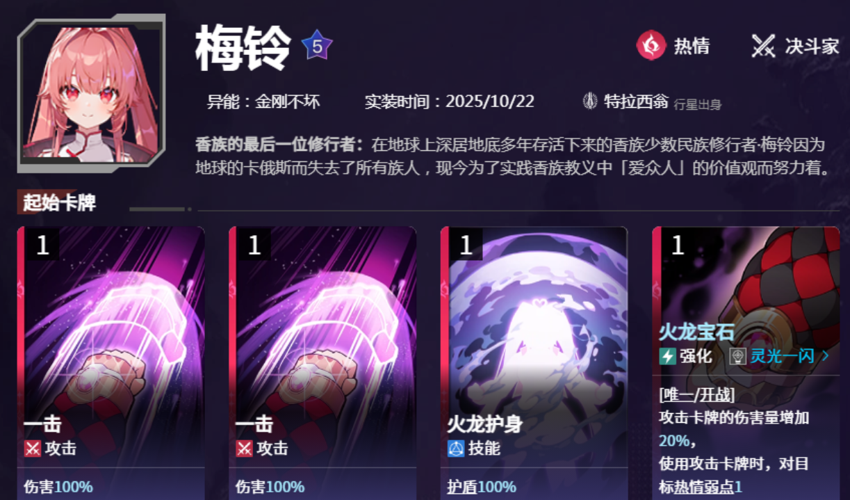 梅玲的强度定位是T0级别的爆发输出角色,她的“升龙”技能除了可以造成高额的伤害输出外,还可以给敌人附加弱点,使玩家更容易击破敌人的防御。梅玲实战中表现很好,特别是打深渊副本、BOSS的时候。她可以在两回合之内稳定清场,在一回合之内秒杀满难度的BOSS,比如星云扭曲螃蟹,表现出色。