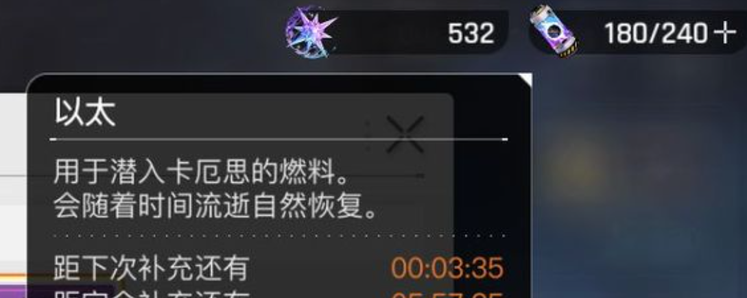 以太为游戏所设定的一种重要的资源,有上限并且能够恢复。每个玩家的以太上限为240点,恢复速度为每5分钟1点。这就要求玩家在游戏过程中要合理地使用以太,不能因为使用过量而影响到之后的战斗或者探索。游戏里有很多途径可以获得以太,用这些道具可以及时补充以太,在出现战斗或者其他紧急情况的时候使用。