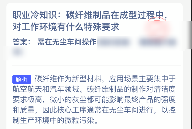 职业冷知识:碳纤维制品在成型过程中,对工作环境有什么特殊要求?【蚂蚁新村每日一题】2025年11月27日题目已发布!坚持答题,积累木兰币,即可加速小镇建设。答对本题,立即可享“产速+3/时”的加速奖励!今天正确答案是【需在无尘车间操作】。碳纤维制品的制作对清洁度要求极高,微小的灰尘都可能影响最终产品的强度和质量,因此核心工序通常在无尘车间进行.