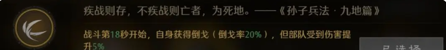 最后就是黄忠他在兵法的选择上面可以搭配的是死地求生这个兵法,这个兵法在其中主要带来的效果就是战斗当中,只要是达到18秒的情况下,大家还存活的话,那么黄忠自身会获得一个倒击倒戈的玩法,倒戈概率的话达到的数值是20%,但是此时如果我方的部队受到敌方伤害的话,那么这里的伤害数值会提升5%,所以在使用黄忠这个兵法的时候,要有一定的取舍才可以,其次如果不用死地求生这个兵法的话,也可以给黄忠搭配奋鼓,这个兵法跟上面关羽带来奋鼓的这个兵法效果是一样的。