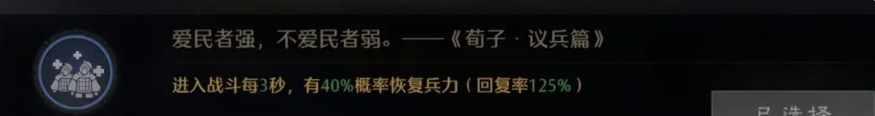 如果是为徐庶搭配兵法的话,这里依旧是有两个选择,首先第一个选择是惜兵爱民这个兵法,这个兵法给徐庶搭配的时候,只要他进入了战斗当中,每3秒的话就可以触发一次,此时的话,会有40%的概率可以给学术带来足够的兵力恢复,概率百分比也非常高,这里达到了125%的恢复数值,所以对于徐庶他在这个阵容当中的持续效果来说是非常有好处的,第二个就是乐善这个兵法,这个兵法相对来说其实是给他自身带来续航能力的,根据他本身的能力可以造成的治疗效果上面会提升10%的数值,对于徐术这样的角色来说,它带来10%的效果虽然不高,但是在整体阵容当中没有其他的武将有恢复类型的效果,所以在这里给他搭配这个兵法的整体效果,就是可以提升阵容当中需要的续航。