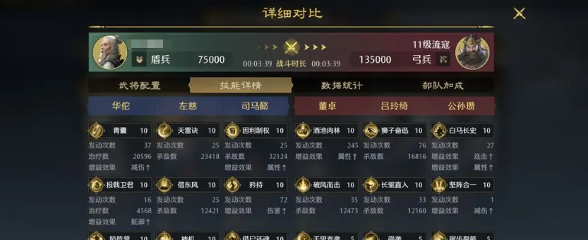 比如说华佗这里可以带的是轻兵急行、乐善、奋鼓,而左慈的话可以带并气积力、活力、固阵,如果是张角的话,这里可以带的兵法是惜兵爱民、活力、固阵之类的兵法,有足够的兵法加成,可以为这个阵容带来足够的标准提升效果,相应的初期变化角度来说的话,其实它带来的整体能力效果上面是非常适合参与前期开荒的,在战报里面大家也可以看到它的一些详细对比,以及其中胜利的概率有多大。