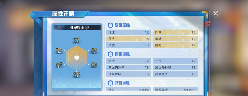 从属性分布来看,森崎有三的核心优势集中在扑救(13)、反应(15)、抱球(14)和耐力(14)这几项上,其中反应值最高,意味着他面对突发射门时能更快做出判断与动作响应。此外,他还拥有5%触发概率的“爆发”特殊属性,一旦触发可提升150%的爆发强度,进一步增强关键时刻的防守稳定性。