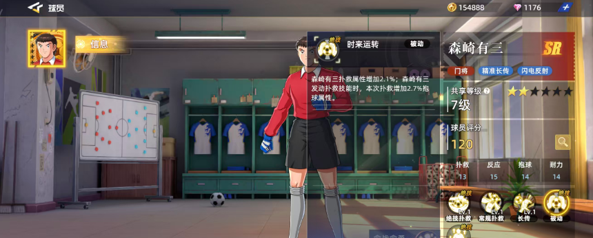 作为专一守门员定位的角色,森崎有三的所有能力都围绕防守展开。其总评分为120,在SR级别中不算突出,但由于高阶门将获取难度较大,因此他在前期出场率相对较高,是不少玩家组建初始阵容时的可靠人选。