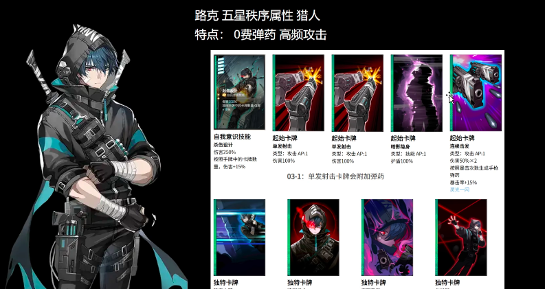 虽然在内测时期对洛克这个角色评价都较为一般,但就其卡组来看,不难推测他的后期潜力还是非常巨大的,尤其是角色的命中2命提升也是比较大的,角色的核心玩法主要是弹药,弹药目前是一个0费的模式,并且可造成高频率的攻击,从卡组阵容来看他使用攻击牌的频率会非常高,并且在费用要求上也比较低,新手玩家可尝试。