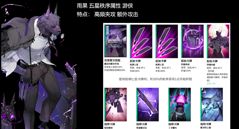 再来看狼哥——雨果,隶属于五星秩序属性的游侠,它的总特点是高频攻击,并且可造成额外攻击,小编接下来来详细说一说,核心被动效果——“狩猎启动”,进入到“狩猎”状态后,如果其他战斗员使用的是单体攻击卡,额外进行70%的伤害,追加攻击减少一层;如果其他战斗员使用的是非攻击卡牌,则增加一层,每层增加30%的伤害,且最多可增加5层,而这一技能无论从伤害,还是额外伤害的数值来看都是相当惊人的。
