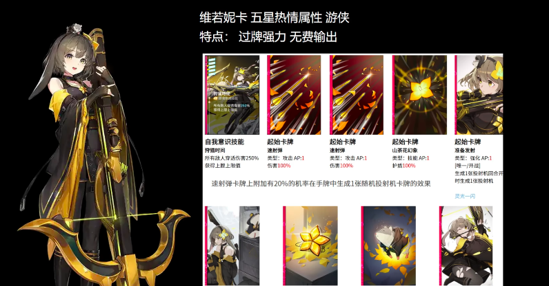 最后推荐的战斗员选手——维诺妮卡,作为五星热情属性游侠,她的过牌能力非常强,而且无费输出模式更是让许多玩家心动不已,在过牌队当中常担任主C,在不少队伍当中也可承担起副c位置,整体表现能力还是非常超群的。