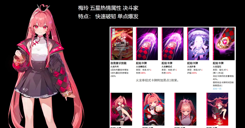 梅玲,很多玩家将其戏称为简单无脑暴力粉毛妹,其在配队要求方面是非常简单的,但整体可以打出非常强的伤害值,能够快速的破韧敌方打出高额的伤害量,角色的核心被动是“余烬”,怪物处于余烬状态怪物受到攻击或者击破时,按照持有余烬数量使伤害量增加30%。发动效果时移除一层于禁,最多可叠加5层,能够不停的给怪物挂debuff。卡牌方面是两个攻击、一个护盾,起始能力卡牌是攻击卡牌伤害增加40%。