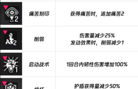 再来分享一下负面词条。脆弱:受到了伤害,直接增加50%,在发动该效果时脆弱减-1。