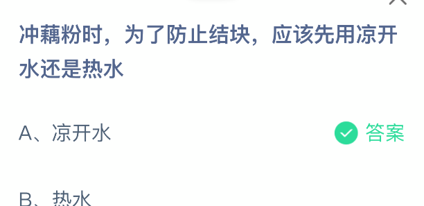 以上就是冲藕粉时,为了防止结块,应该先用凉开水还是热水,支付宝蚂蚁庄园2025年11月29日答案最新,更多精彩内容,请点击关注更新!
