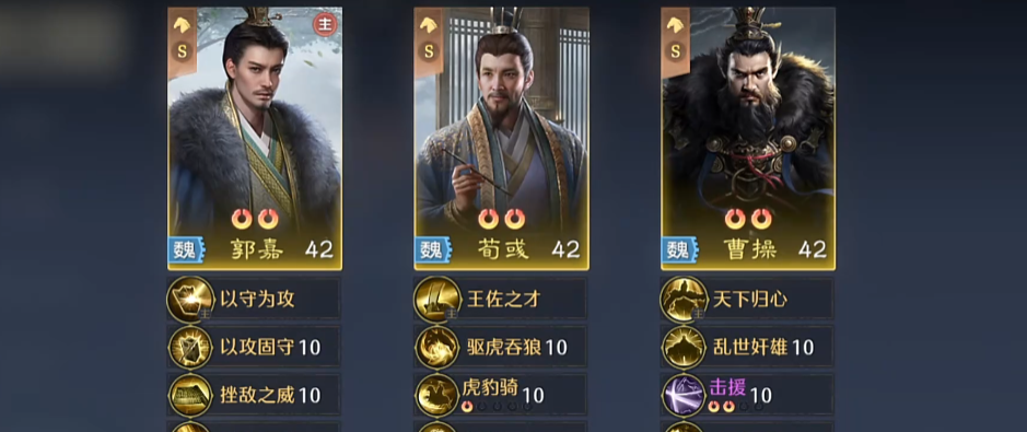 大家都知道游戏当中的这个谋略体系,在大多数人的印象当中,比如甩技能放火、放电这种可能就用这个体系,但是这这个队比较有才,他是一个以突击为主的谋略队,更偏向于这种文武兼兼备的感觉,然后这个队的总体效果其实用起来还是不错的,因为这个队他自身携带的技能本身就有一定的空间可以用起来,这里根据阵容需要的能力搭配的武将就是郭嘉、荀彧还有曹操,这三个角色放在一起的话,搭配起来的魏国智力队整体效果是比较强势的。