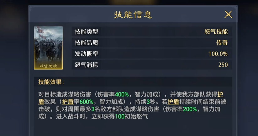 这里在整体的技能效果上面,首先曹操他在怒气技能效果上面,可以根据以守为攻这个技能牌带来足够的队伍加成,此时对目标造成的谋略类型伤害数值上面有400%的概率,而且可以带来智力上面的加成,还可以使我方的部队获取护盾的效果,这里护盾的概率也达到了600%的一个属性数值,在有足够智力加成的情况下,持续3秒的这样一个效果可以给我方带来非常强大的防御,所以并不是智力型的武将就不好用,那么在这里护盾持续的时间之内,只要在时间结束之前被对面给击破的话,那么此时我方的其他武将还可以对周围的敌人,最多3名敌人进行一个输出。