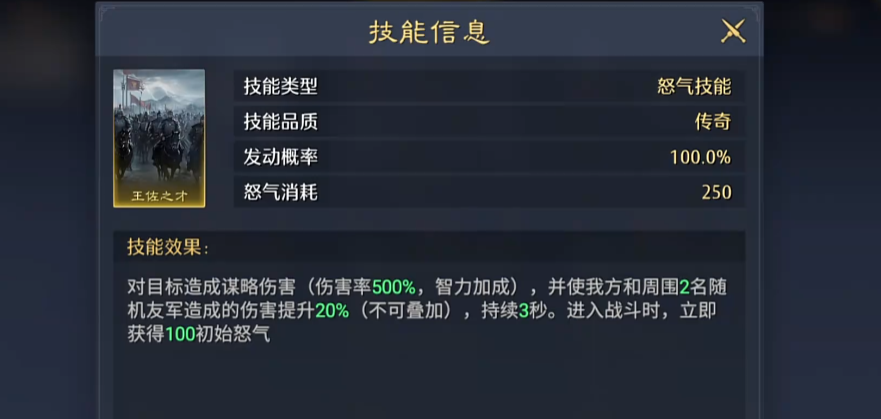 所以放在这里的话,郭嘉也可以跟荀彧的技能王佐之才放在一起搭配使用,而王佐之才这个技能相对来说的话对目标只要造成谋略类型伤害的话,带来的百分比就一定能高达500%,这样的输出数值放在主动技能里面也是非常好用的,而且目前的发动概率也达到了百分之百的一个概率,在成功输出之后,他还可以给我方以及周围两名的随机队友带来一个伤害提升的增益,虽然这个增益只能带来20%的基础提升,后期还不能叠加,但是这里带来的持续时间有3秒,所以利用这3秒大家就可以跟他的技能进行搭配,跟其他武将一起进入一个集火的战斗,此时进入战斗的话,武将自身也会有怒气数值的加成,因为这个技能卡给荀彧带来的就是初始情况下就有100点怒气积累的一个效果,所以这三名武将目前带这样的武将卡在前期,其实大家使用怒气大招的情况还是比较多的。