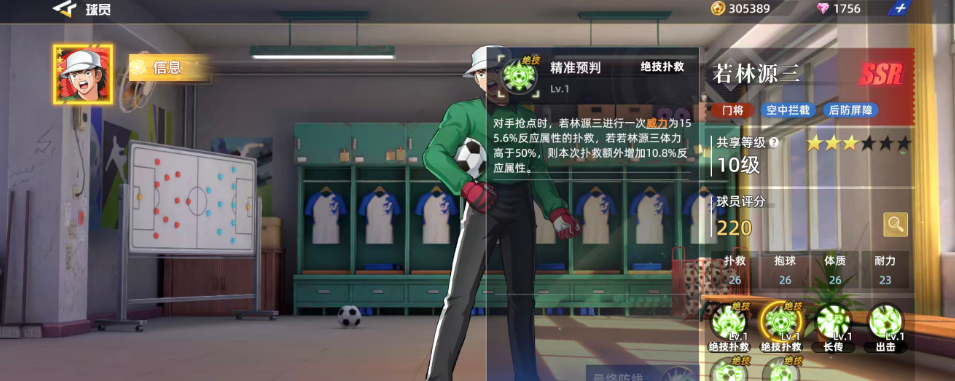 第二个扑救的动作就是精准预判这个技能,这同样是一个扑救的动作,不过需要在对手抢点的时候才能使用,使用的时候若林源三进行一次威力为155.6%反应属性的扑救,若若林源三体力高于50%,则本次扑救额外增加10.8%反应属性,所以其实两个扑救动作带来的属性效果也不太一样,在基础数值上面也不太一样,后期打击在球场上面使用自然要根据不同的情况来使用才可以,除了这两个基本的扑救动作之外,若林源三也是有其他的动作招式可以给球队带来基础能力的。