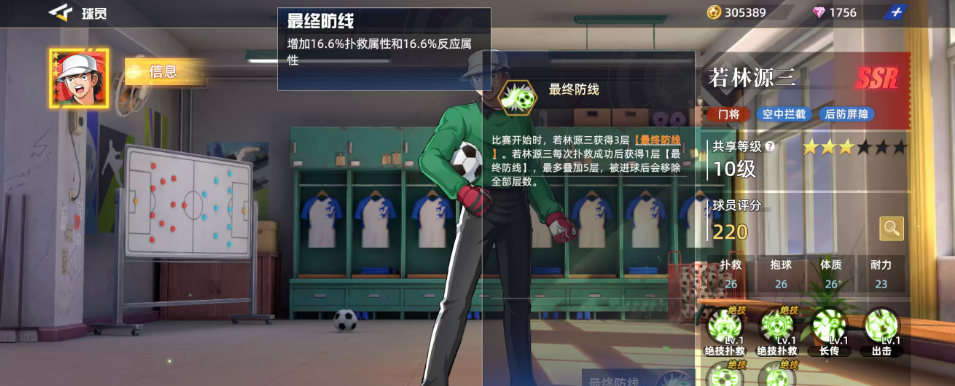 最后一个技能叫做最终防线,在比赛一开始的时候,若林源三凭借这个技能就可以获得3层【最终防线】,而且在若林源三每次扑救成功后获得1层【最终防线】,叠加到5层的时候最强,但是被进球后会移除全部层数,这里最终防线的效果就是增加若林源三16.6%扑救属性和16.6%反应属性增益哦。