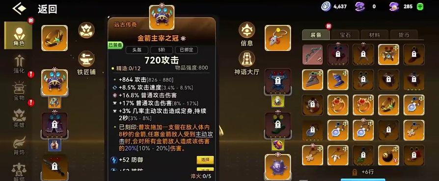 猎手玉扳指为他带来9%左右的普攻伤害提升之后,还有一定的生命加成,1000多点的生命加成,会让他后期在刻印之后,普攻获得20%的攻击速度加成,攻击速度对于攻击流来说也是非常重要的,而金箭主宰之冠其实是很多玩家玩弓箭流比较固定的一个搭配,它作为传奇品质的装备,经常会跟弓箭流的速射一起出现,它的能力都是会为弓箭流带来足够的速度加成,而且有一个造成定身的能力,会让敌人持续两秒站在原地,所以这样的效果放在弓箭流里面使用起来的话,非常适合搭配蓄力输出,最后的魔力护腿带来的也是生命数值以及速度加成的效果。