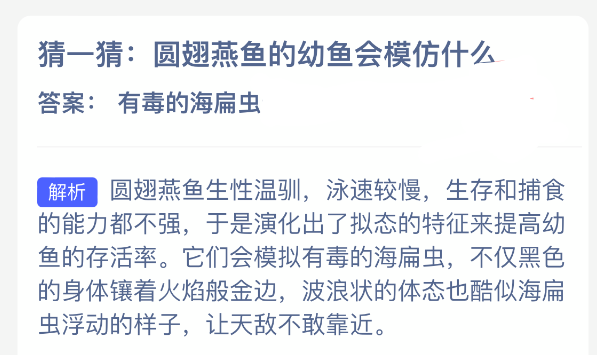 以上就是猜一猜:圆翅燕鱼的幼鱼会模仿什么?神奇海洋今天答案最新2025年11月30日分享,更多相关攻略内容,请点击关注更新!