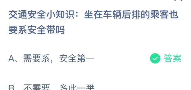 以上就是交通安全小知识:坐在车辆后排的乘客也要系安全带吗,支付宝蚂蚁庄园2025年12月2日答案最新,更多精彩内容,请点击关注更新!