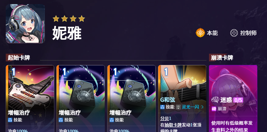 在后期有强化类型的卡牌当中,还可以增加我方队内的17回合增加效果,那么在这里为她搭配妮雅的话,主要是因为妮雅放在辅助的位置上面使用,增幅治疗是非常强势的,这里技能的话,用处其实是可以跟唯一的技能搭配起来,而且妮雅在自身技能效果上面如果产生了灵光一闪,那么在这里用到重音闷音这张卡牌的话,还可以丢弃掉目前费用最高的一个卡牌,此时拥有这个卡牌的战斗员,还会对随机的敌人造成150%的额外伤害数值,这样的效果其实用卡牌的能力来说,只要能够造成灵光一闪,能的效果带来的控制能力也是非常强势的,基础的卡牌上面,妮雅用到的除了技能恢复的效果之外,还有一个G和弦这样技能卡,在这个技能卡牌当中,大家是一般在抽取卡牌的时候可以用到这个初始的卡牌效果。