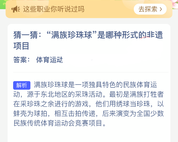 以上就是猜一猜:“满族珍珠球”是哪种形式的非遗项目?支付宝蚂蚁新村最新答案2025年12月2日,更多精彩内容,请点击关注更新!