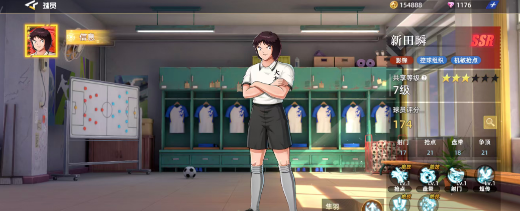 那么最后为大家还可以推荐一个前锋球员,就是新田瞬,新田瞬作为一张红卡球员的时候,他除了放在前锋上面使用的话,也可以当做影锋角色使用,那么他这里达到此类品质的话,常见的六维图当中其实比较强的一个效果就是进行抢球,他后期也有此类技能可以进行,使用如果再发送一次威力达到115%左右的射门时带来的时机效果,可以根据他的招式进行百分比加成,这里根据他的百分比带来的射门动作,还可以搭配后期的短传进行各种连招动作使用。