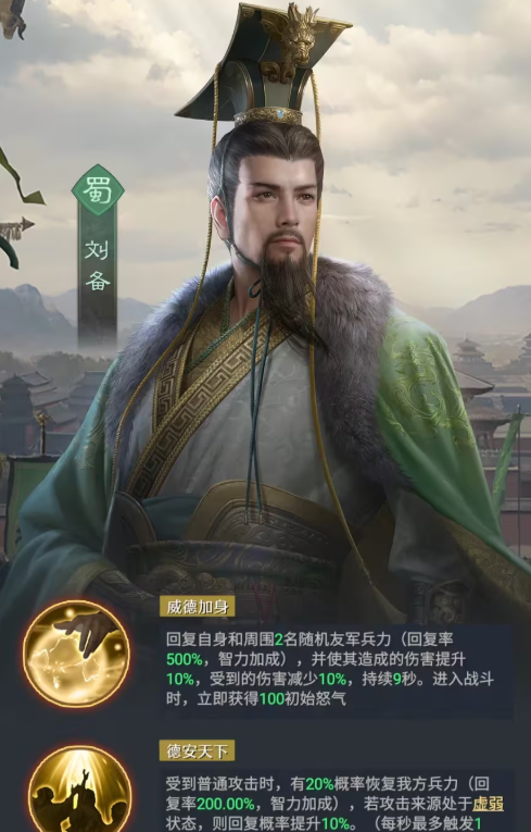 这里整个阵容只要围绕着重伤能力带来的效果,可以让对面受到持续的物理伤害,并且在降低移动速度之后,会有10%的一个加成,只要这个重伤叠加到三层之后,还可以附加持续的虚弱状态给到对方,所以在其中可以让对面的输出降低的百分比达到一个70%的数值,在削弱目标攻击刘备的时候,还会有更高的概率可以触发刘备德安天下的技能来达到回血的效果,所以放在这里使用的话,大家只要玩好他的重伤能力,就可以保证这个阵容里面有足够的伤害可以用到。