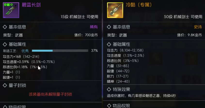 这里如果要达到55级的话,那么建议大家使用的其实是一些史诗级的武器,因为50级其实在游戏当中就是一个非常重要的坎,在其中大家优先选择一些数值比较高的武器,比如说这里给大家推荐的就是冷酷,冷酷的基础的攻击能力上面能够带来的提升数值达到了73~121之间,那么后期大家还可以通过改造一及套装的增幅来给整体的数值带来足够的收益,当然如果对面的boss会爆发的话,那么这里大家能够搭配一个迷茫之斩的效果,这样就可以提前去降低敌人身上的攻速以及防御数值,所以在搭配上面来说,对于机械剑士还说是一个更好的选择。