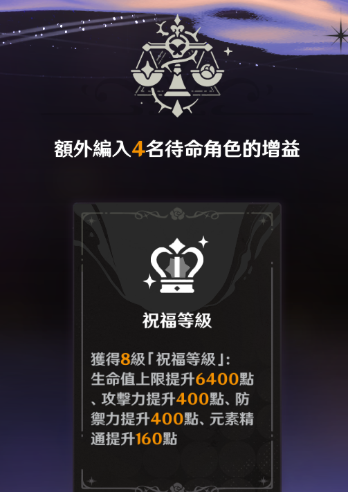 如图:初始多4名角色就会提供大量属性,后续元素BUFF点满还会进一步提高属性。