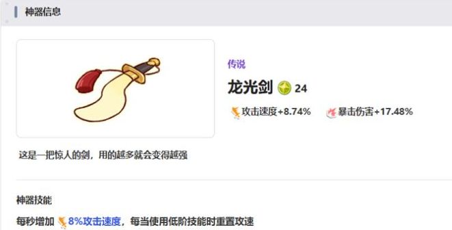 龙光剑还是很有实用性的,对物理性输出来说,这就是一个天花板一样的存在。有8.74%的攻速加成,还有17.48%的暴击伤害,加上每秒叠加8%的攻速。可以让频繁出手的输出角色,技能循环节奏飞起,持续输出能力,也可以提升。追求爆发的刺客类角色,暗杀者的秘籍,也是重要的选择。12.24%的攻击速度,还有8.74%的暴击伤害基础加成,另外还有每5次普通攻击触发的欺骗效果。