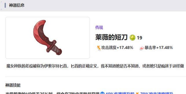 喜欢高风险的玩家可以关注莱威的短刀。有17.48%的攻击速度,还有暴击率,这一种加成还是很亮眼的。角色的生命值如果低于25%就会触发7秒的无敌状态,同时可以获得79%攻速加成,还有40%伤害提升。持续输出型角色会比较适合装备天气晴朗卡,会有17.98%的攻击速度,还有暴击率加成。每三次普通攻击之后,还会有闪电追加打击,可以造成150%的攻击力额外伤害。