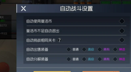 这里面有一个选项就是让你自动使用复活币了。要是你的角色在战斗中死了的话,系统就会自动使用复活币来复活,一直到复活币用完,或者是副本通了关为止。这个功能就比较适合那些不想要老是看着屏幕的玩家们,死了以后也可以直接复活,手动操作根本不需要,省去很多的麻烦。
