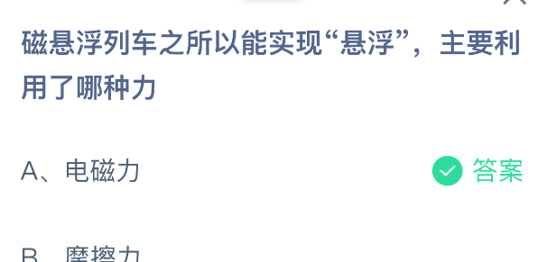以上就是磁悬浮列车之所以能实现“悬浮”,主要利用了哪种力,支付宝蚂蚁庄园2025年12月6日答案最新,更多精彩内容,请点击关注更新!